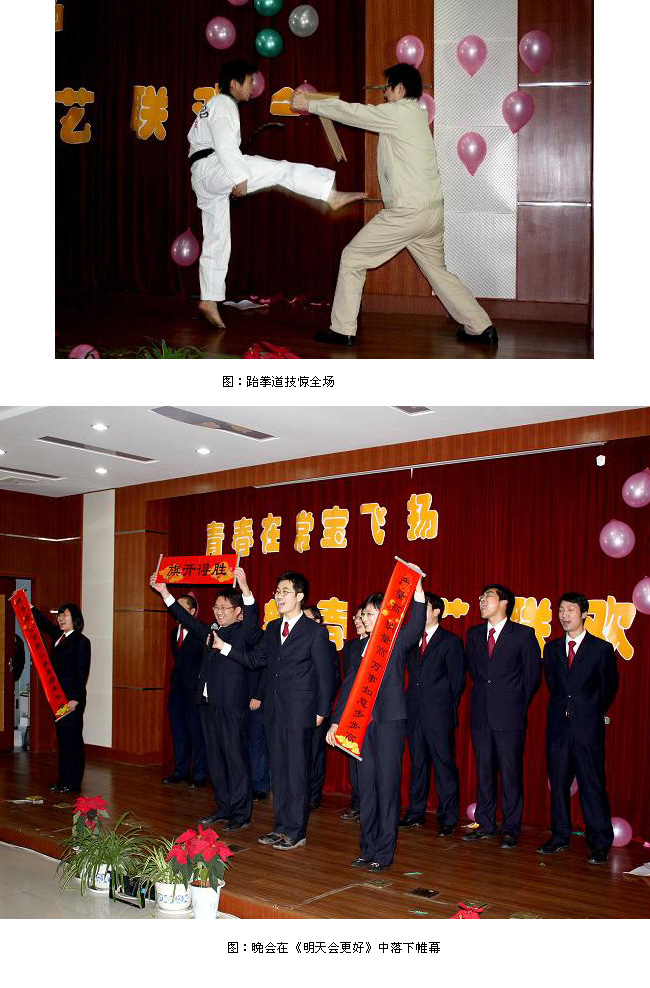 伴隨著一聲“起航了”,“青春在常寶飛揚”迎新春聯歡會在ERW項目組的合唱“眾人劃槳開大船”中拉開序幕,一首首悅耳動聽的歌曲,一句句妙語連珠的話語,一張張充滿青春朝氣的笑臉,組成了一道道亮麗的風景線。新進大學生自編自導的三句半《繼往開來說常寶》讓大伙開心不已;裝備部陳娟的一首《一個人的精彩》贏得陣陣熱烈掌聲;相聲《現代版的大話西游》及小品《常寶新聞》詼諧幽默,讓大伙笑的直不起腰;榮獲一等獎的武術表演《跆拳道》與《雙節棍》出色的功夫讓大家大開眼界;還有多才多藝的鄭玉平女兒鄭亞南小朋友帶來的二胡獨奏《蘇北小調》給我們留下了深刻印象;當然也少不了情歌對唱,充滿活力的帥哥彭福本與靚麗文靜的廖濤一曲《你是我心內的一首歌》,讓參加聯歡會的同事們紛紛陶醉。熱烈的氣氛、優美的歌聲、歡樂的場面、燦爛的微笑,讓公司員工度過了一個輕松的下午。在外貿部全體員工《明天會更好》的歌聲和掌聲中,聯歡會降下帷幕。